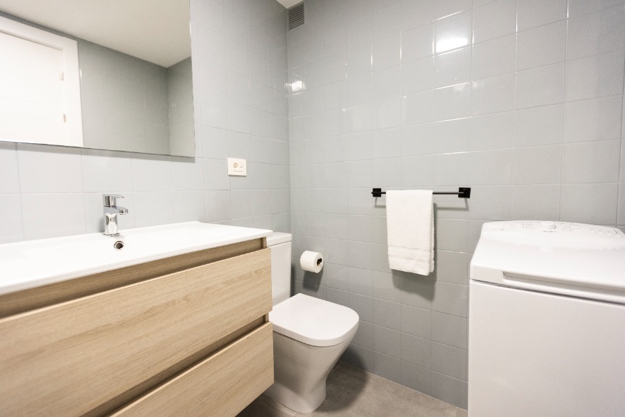 1 aseo -aseo, lavabo, armario de baño y lavadora.