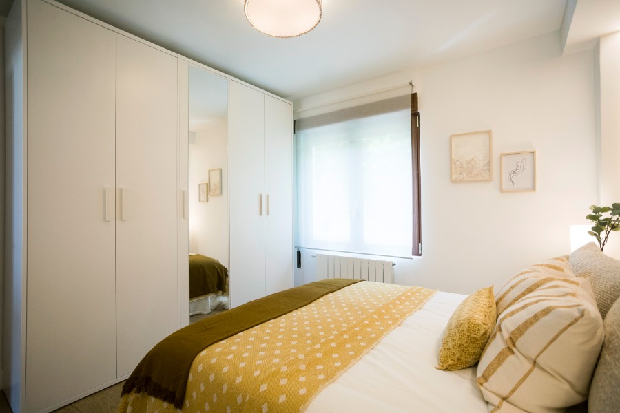Habitación 1: 1 cama doble, dos mesillas con lamparitas, armario con perchas y espejo.